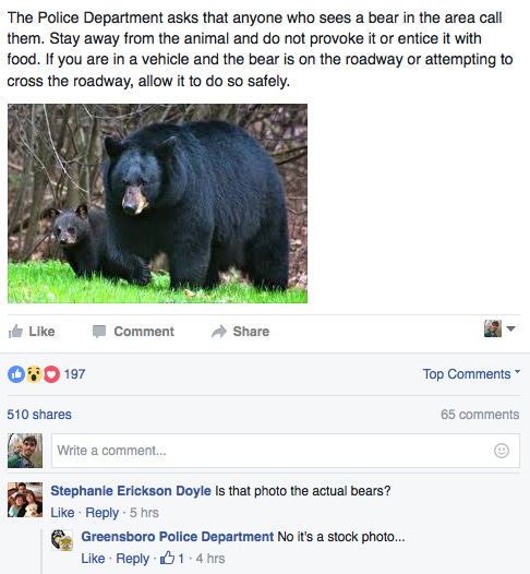 I know what you’re thinking. A bear? In a city? What? I know! Five years ago, there was another bear in Greensboro, who got his own Facebook page and Twitter account, which were maintained for an entire week! Sure, it was funny, although there were moments of stark truth: