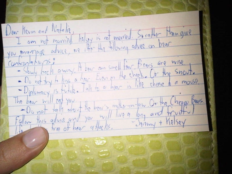 What would I do if I saw the bear? Six years ago, before I was married, I was invited to an engagement party, and was asked to write some marriage advice on to a note card. I did not have any marriage experience, so I decided to write everything I knew about a different topic: