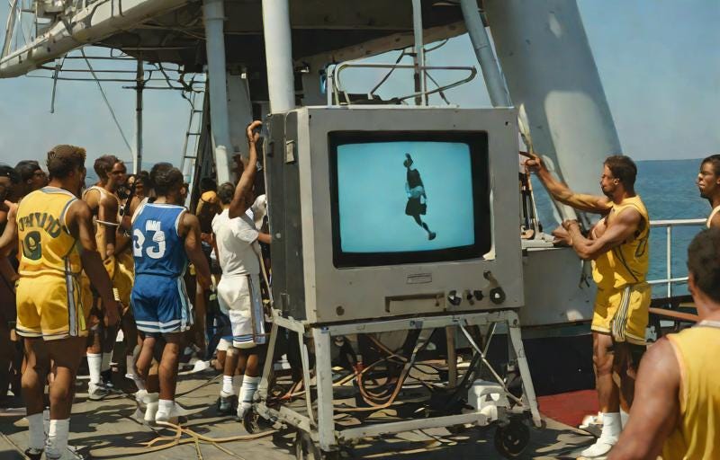 I get it. So, I think, for one last time, we should retire the images of the TV cart with a proper farewell. Here’s what one AI program came up with I asked it for an image of a “tube television on a metal AV cart being saluted by basketball players as it’s pushed off the side of a ship”: