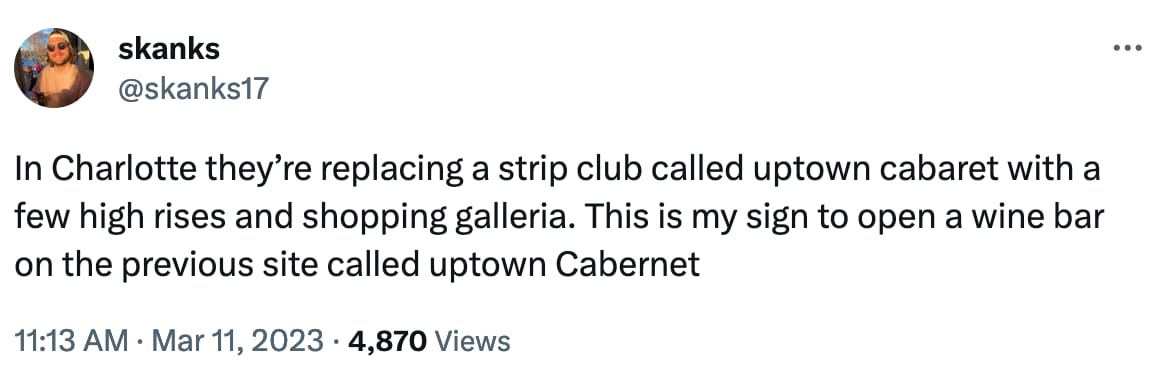 There will be no strip club on the property. The Uptown Cabaret says it’ll reopen somewhere else next year. There will be no tributes to the land’s former occupants, even though as a Dad Joke Enthusiast, I really dig this idea: