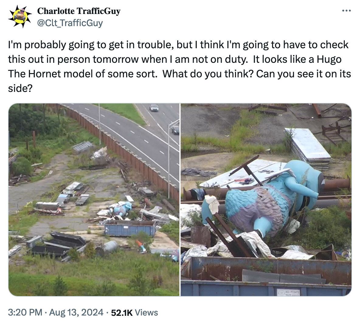 So in summary: An ad agency commissioned two 19-foot-tall Hugo the Hornets to go on billboards near Uptown Charlotte a decade ago. Those bugs were in place for less than a year before being taken down and unceremoniously dumped in a billboard junkyard on the east side of town. They then sat there for nine years before anyone other than curious urban explorers noticed them. One part of me thinks this is somewhat existential: We, like Hugo, will all at some point have been dead longer than we were alive. Another part just keeps repeating the old NBC slogan: “If you haven’t seen it, it’s new to you!”