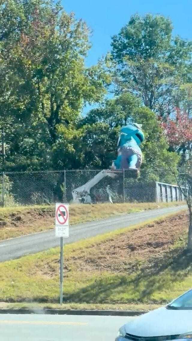 Your eyes are not deceiving you. That is a very large Hugo the Hornet just lying there on its side, missing its cartoonishly gloved right hand. It appears to be near a highway of some sort. And there’s more than one. There’s a blue leg sitting in front of a dumpster. Which, if you are a young, impressionable Charlotte Hornets fan, is the stuff of nightmares. The hive was alive, you’d say, bolting upright in your bed. But Hugo was DEAD!
