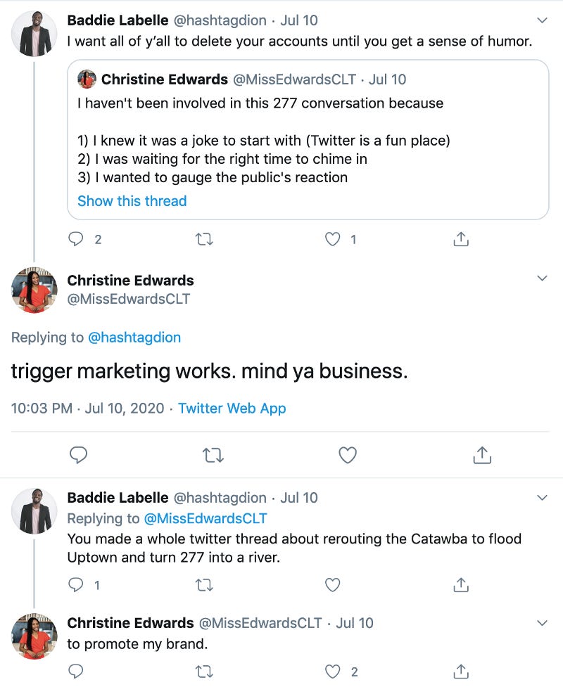 But! That was “Then.” Things have happened since “Then.” Serious things. So today, you aren’t actually thinking about turning I-277 into a river. Are you? What with the problems out there with [gestures broadly]? Of course not, you’d say. It was a joke! Can’t you take a joke? Today, a bold, deranged proposal like this starts off innocuously only on Twitter. And then some people make dad jokes about it, and then someone else steps in and says “I can’t believe we’re talking about X when Y is a problem,” and then people dunk on that person, and then we’re just dunking dunking dunking. If you hinted at the fact that this might be a real idea, you set yourself up to be Greg Paulus on the receiving end of a Danny Green nutmegging.