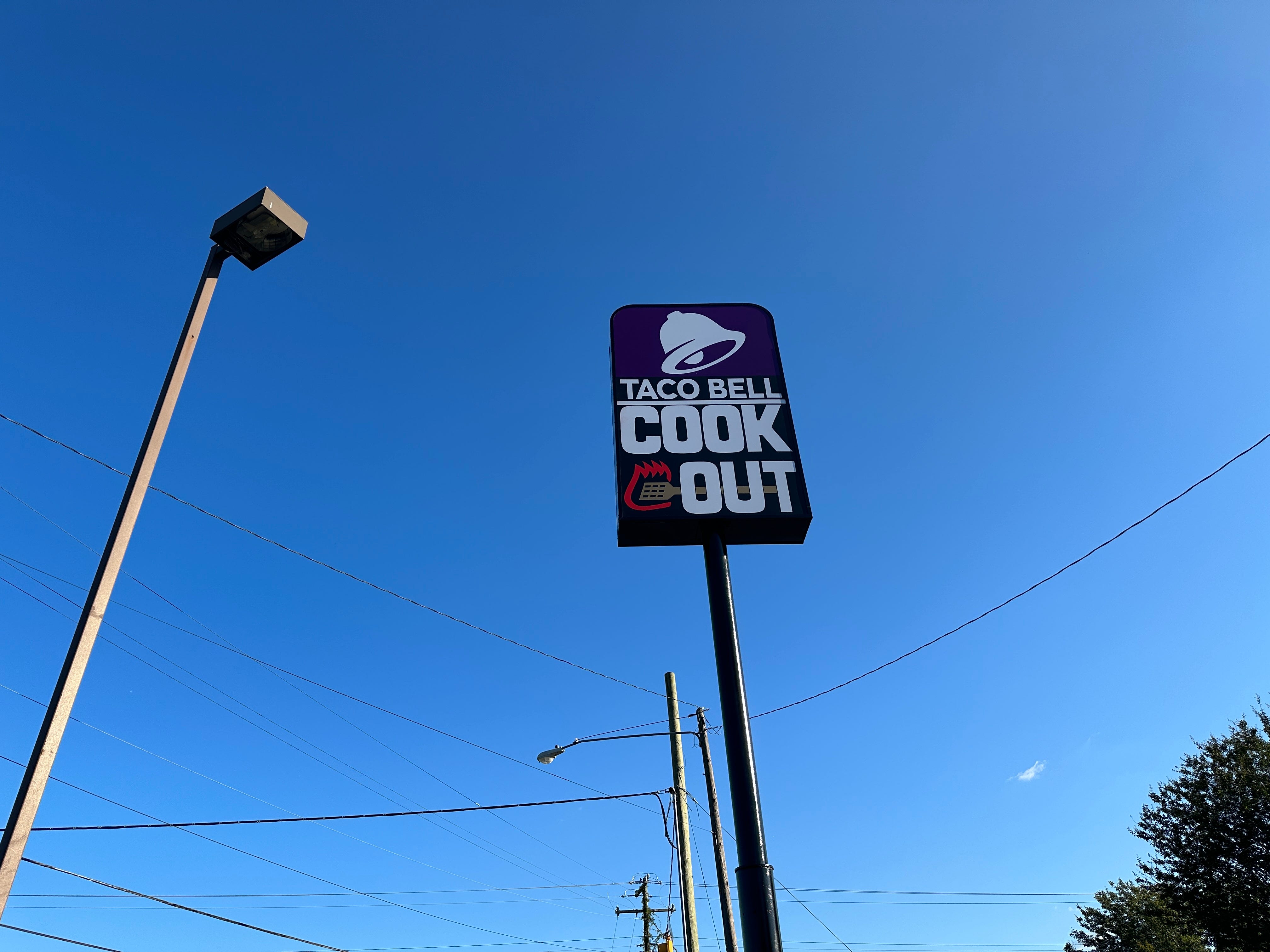 Unfortunately, that didn’t happen this time. I contacted Cook Out’s corporate office in Thomasville and left a message for their marketing department. I’m not holding my breath for a return call, since Cook Out notoriously does not talk to the press, like, ever. So I tried another route and contacted Charter Foods, which owns this particular Taco Bell franchise (almost all Taco Bell restaurants are run by franchise owners, not the corporate parent). “That is a weird one,” the woman on the phone said in response to my admittedly weird questions about the sign. She did say that the company currently had no Taco Bell/Cook Out hybrid restaurants out there. I did leave two messages with Charter’s development guy to see if they were thinkin’ about it, but again, never heard back. I’ll leave it to Taco Bell Quarterly to get to the bottom of this.