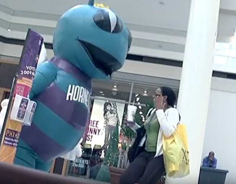Brazley was the only person in the video who knew what was going to happen. He knew to act scared, but didn’t know how, exactly, until the exact moment when Hugo lunged at him. His knees buckled. He grabbed on to his cart. And then, he took a roll of trash bags in his hand and smacked Hugo in the face. That wasn’t planned. That was a reflex. And then he kept going. He didn’t know the guy in the costume. He didn’t stop to find out if he was okay (he probably was).