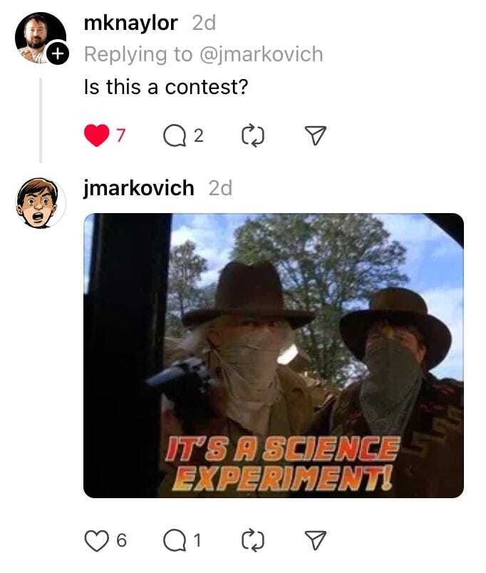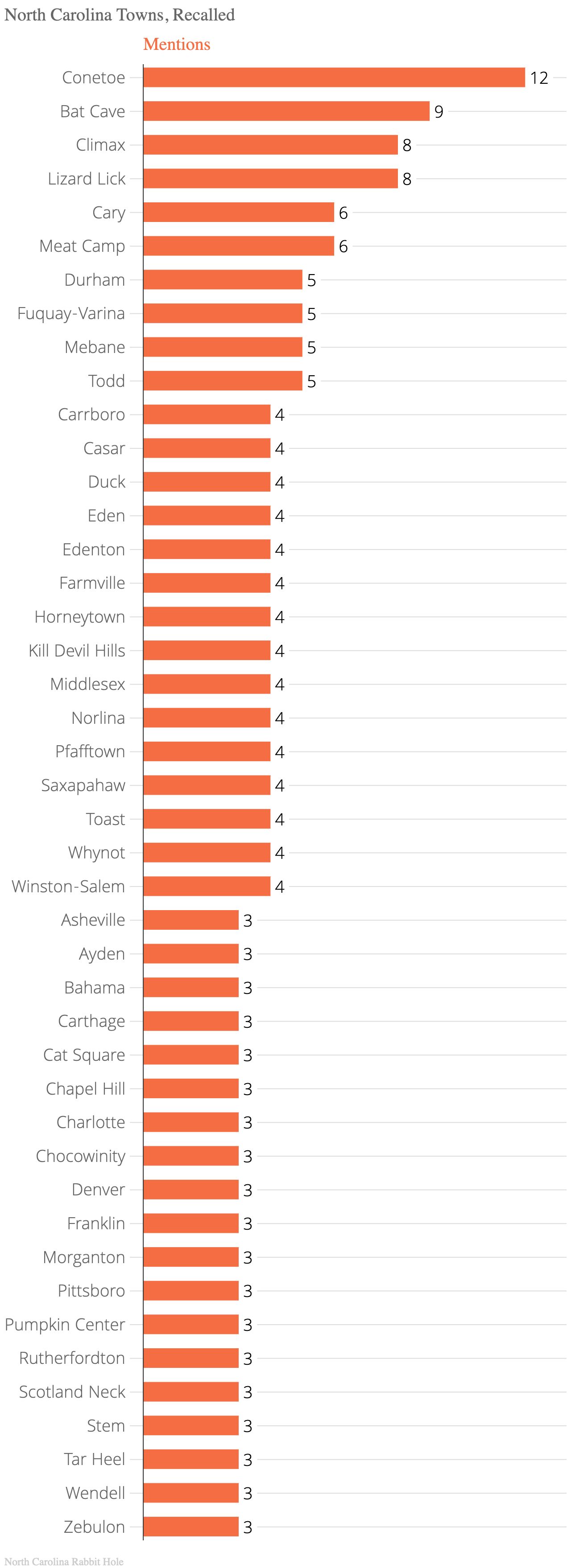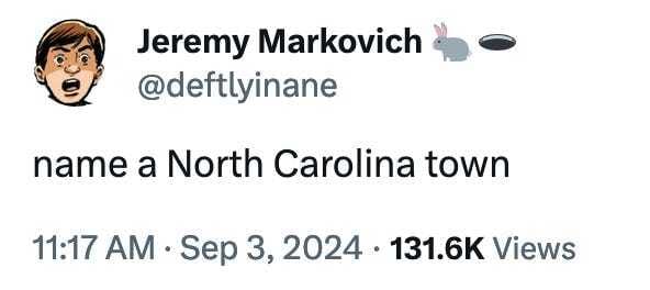 Yeah, it worked. As of Wednesday night when I stopped counting, those five words elicited 619 responses across Twitter, Threads, and Bluesky. I did not ask people to name a CATEGORY of North Carolina town. I did not give parameters. In fact, hardly anyone asked WHY I was asking, except for this guy: