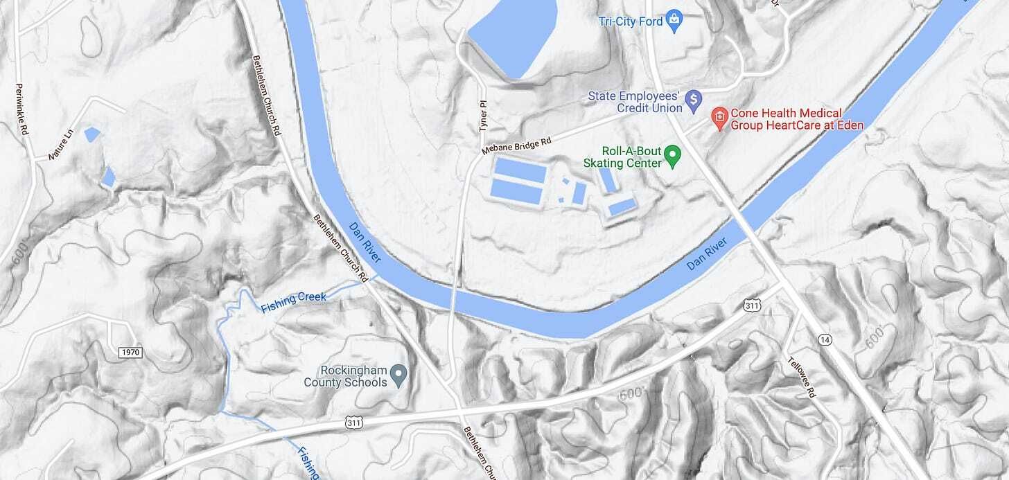 In the early 1920s, Mebane (who, I should point out, is not the Mebane that the town of Mebane is named for) wanted to build a new factory on the north side of the Dan River in Eden. But there was a problem: The railroad tracks that he needed to ship everything were on the south side. The county was already building a bridge, but it was a mile-and-a-half away. To get to that crossing and then over to the railroad, Mebane’s drivers would need to wind through two small villages. That was going to be annoying. So Mebane asked the county to build him, basically, a bridge of his own at the spot where Fishing Creek dumps into the Dan. It was out of the way for the locals, but perfect for Mebane. County leaders said… no. “So he did what any enterprising entrepreneur would do,” says Richman. “He got engaged in politics.”