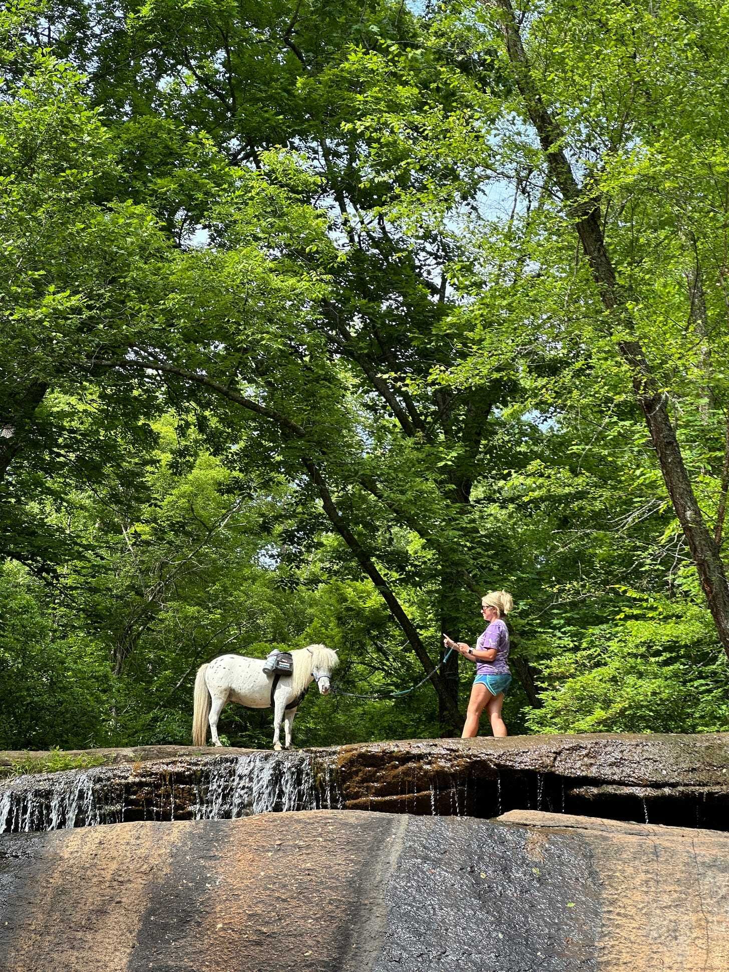 I’m really burying the lede here though. Not even a quarter-mile down the trail is Fall Creek Falls, a 20-foot-tall rock formation with water flowing over it. It’s far from the biggest or most majestic waterfall in North Carolina, but it’s a waterfall, and it’s close by, and it gets the job done for us. The kids can wade in at the bottom and climb up a dry part of it without getting dangerously high above the water. People throw up hammocks. They sit on a bench at the top and look down. They stop looking at their phones because they don’t have service. They bring their dogs, who get to wade or swim in the cool water. Our goldendoodle puppy, Millie, was a bit tentative, but she did pose for at least one picture.