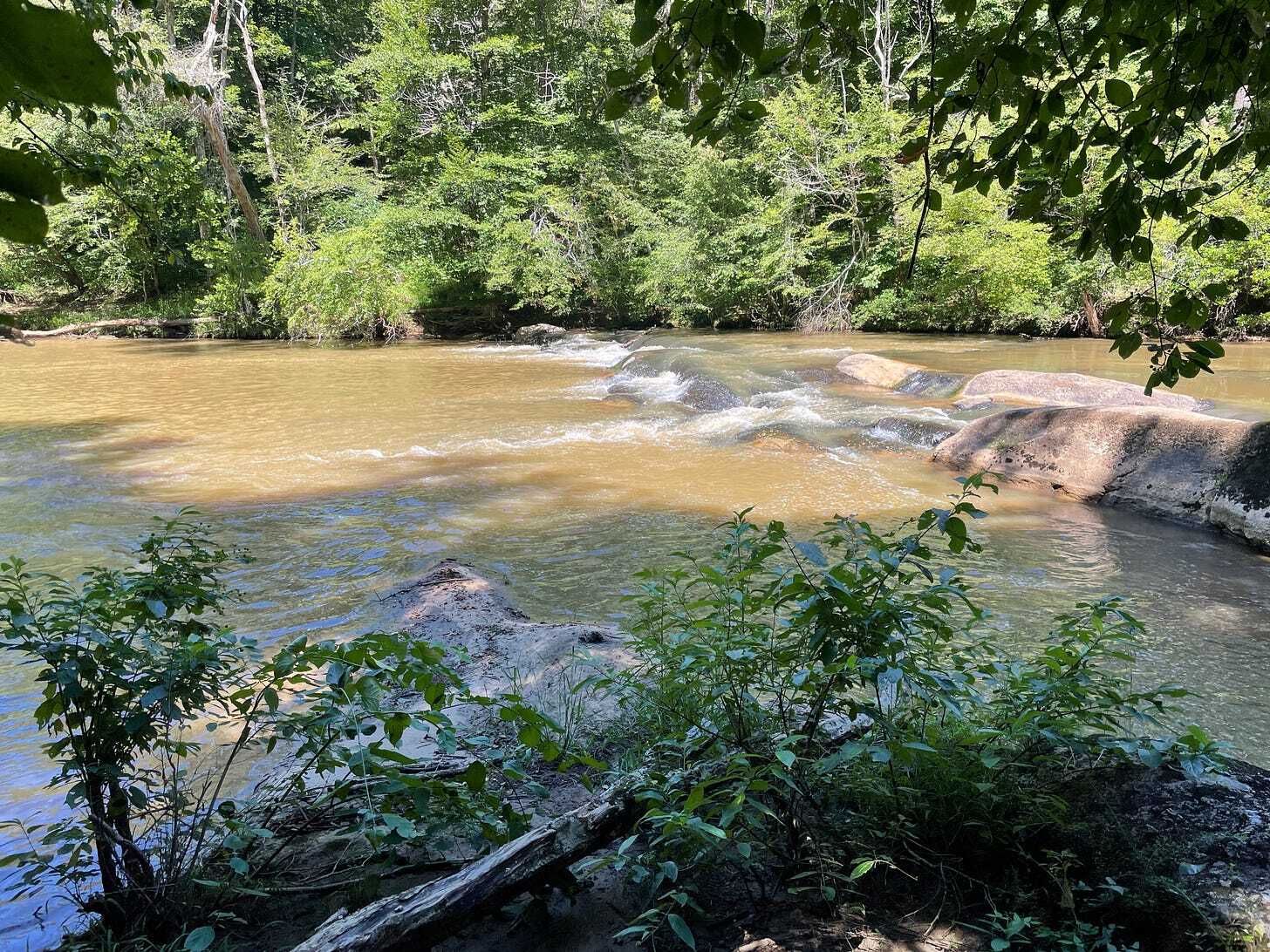 The trail there is only 1.3 miles long, and runs from the parking lot, along Fall Creek, then heads north along the Mayo River and passes the point where it splits into north and south forks. At Byrd’s Ledge, a rocky section the crosses the entire North Mayo, the path officially ends at the state line, which is marked by a tree with yellow stripes.