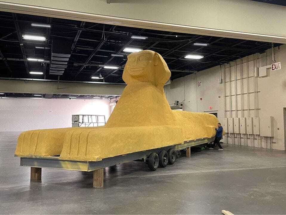 This particular Sphinx was 50 feet long, 16 feet wide, and made from wood, PVC, foam, and stucco. It does not, the listing says, include the trailer that it’s sitting on in the picture.