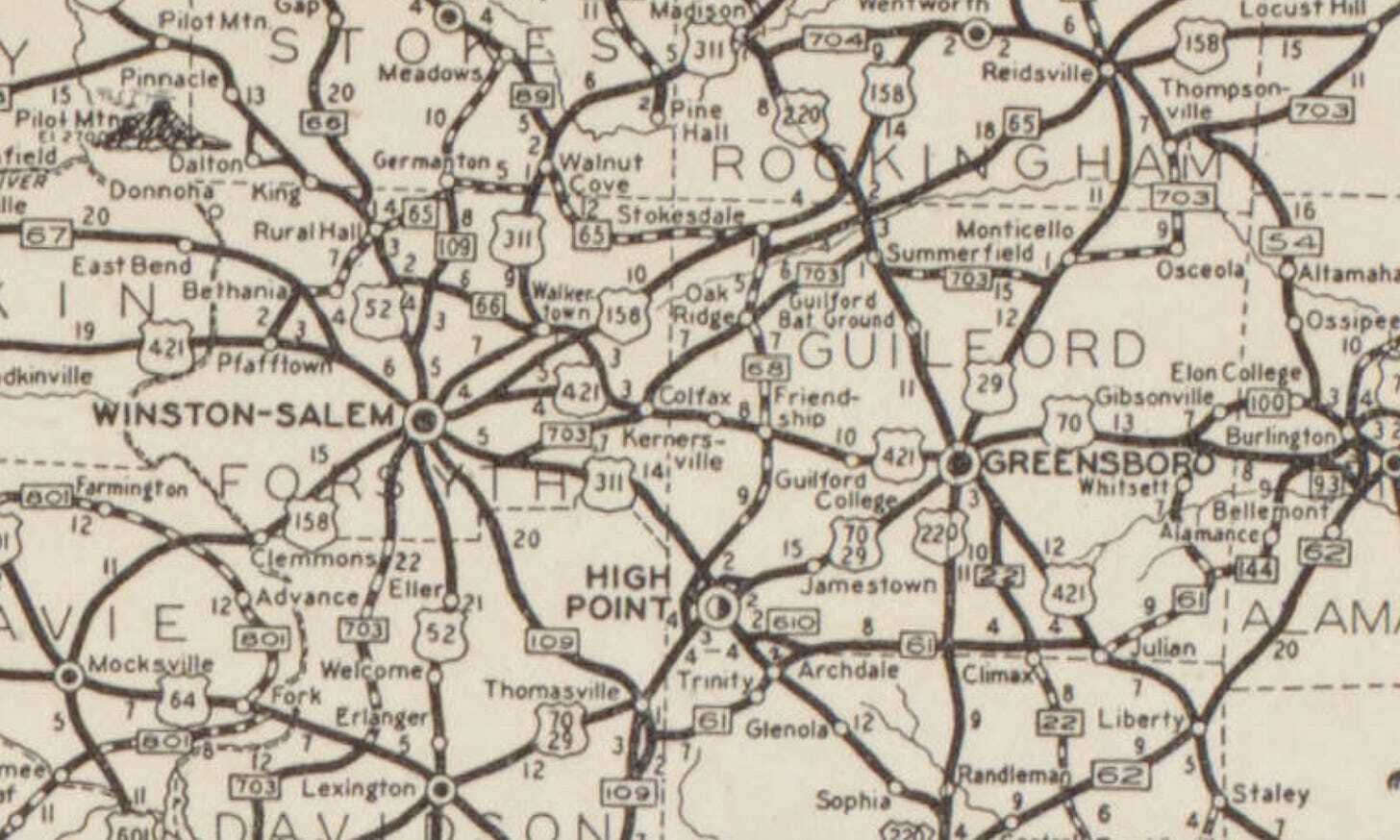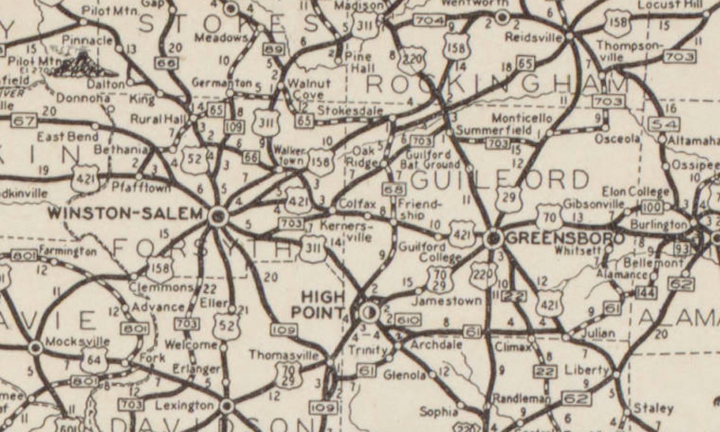 That’s certainly the case for the Greensboro-to-Winston-Salem flight. If you got on the plane in Greensboro, you were probably going somewhere further west. Also, in 1948, only one out of every two American households owned a car. It was harder to get between the two cities but not impossible. Interstate 40 wouldn’t begin to be built in the area until the mid-1950s, but two-lane Highway 421 connected both cities. There were bus lines between Greensboro and Winston-Salem. The Southern Railway had stops in both cities, and you could from one city to another in 1952 in just 45 minutes (a drive with no traffic today takes about 30).