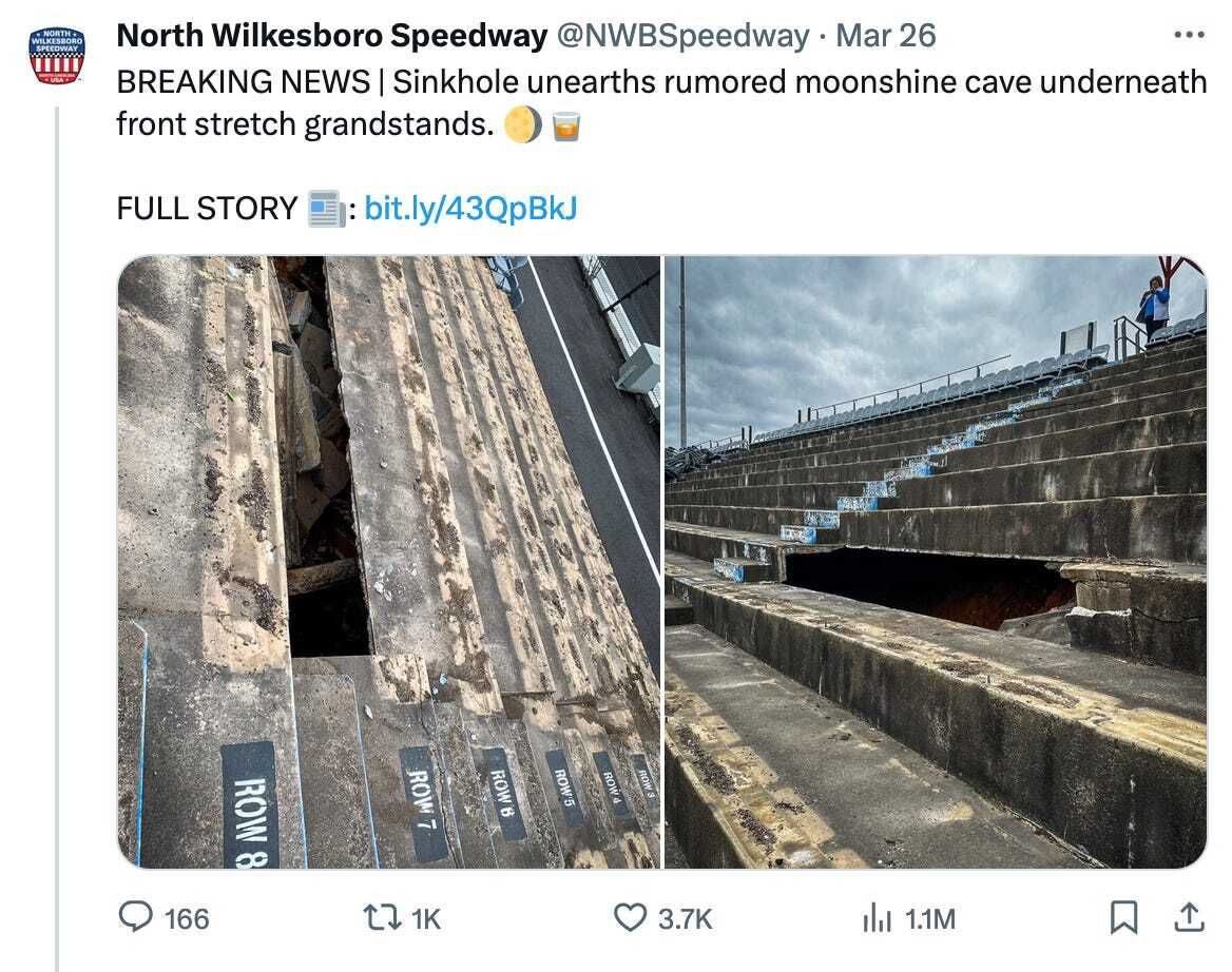 Over the years, people figured that someone was probably making moonshine out there, but nobody had ever found proof. And then construction workers found a giant hole under the Turn 1 grandstands. The circumstantial evidence feels strong. Of course, there’s another piece of circumstantial evidence here: North Wilkesboro Speedway is hosting the NASCAR All-Star Race next month. How convenient that this story dropped now!