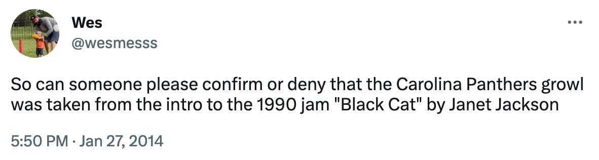 Now, look. I don’t know what Jerry Richardson was into back in 1989. But even though “Black Cat” was released as a single in 1990, it was included on Janet Jackson’s “Rhythm Nation 1814” album, which came out on September 19, 1989. A reminder: Jerry Richardson put the PNTHRS license plate on his Bentley a few months later, in December. I’m not saying that the Richardson family was so smitten by a sound effect from a then-unknown track off of “Rhythm Nation” that they named an entire NFL football team after it. But I’m not not saying it.