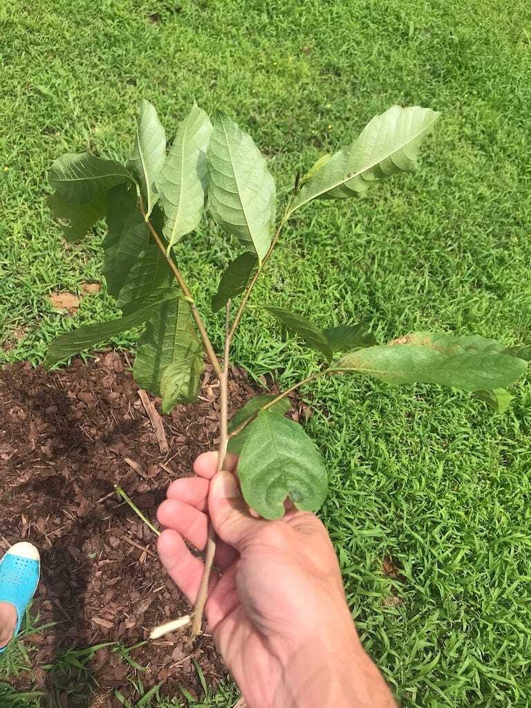So, one weekend in 2018, when my wife was out of town, I took the kids over to the agricultural extension office in Winston-Salem, which was holding a garden open house that included a pawpaw tasting. I wanted to make sure I enjoyed this fruit before I converted my hillside into an orchard. I ate one, then instantly forgot what it tasted like. That’s because, a few minutes later, I tripped on some stairs and gashed open my leg something awful. After an extension agent fetched me a first aid kit, I asked her if the guy selling trees was still there. “Just missed him,” she said.