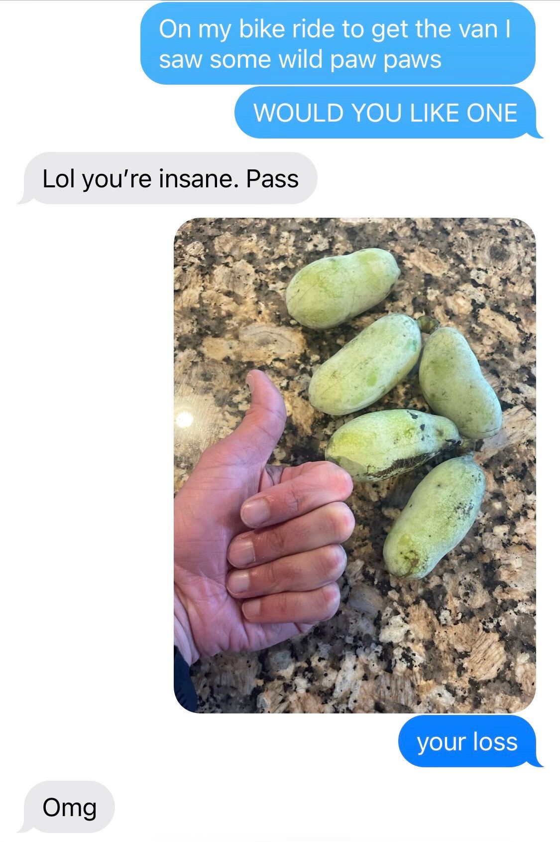I started to tell my new coworkers about it. Do you even know what you have right there on the other side of the parking lot?! I’d say, as if I’d stumbled on the entrance to a gold mine. I found myself doing PR for the pawpaw for some reason, even though I couldn’t vouch for their taste, thanks to my memory-wiping leg injury. I futilely tried to remain calm and patient. After all, I had big plans for these pawpaws, which felt like the only ones in the known universe.