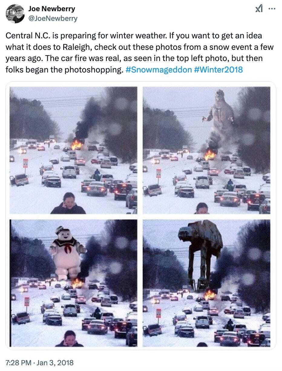 That picture has incredible staying power. Every time there’s the threat of snow in Raleigh, it shows up, right on cue.