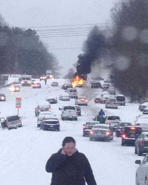 This shot has it all. A car on fire. A yard sale of vehicles. A woman nonchalantly making a phone call, as if she ordered the hit. If you want to make the point that Southerners can’t drive in the snow, you would start by silently sliding this picture across the table, folding your hands, and dryly saying: “Your move.”