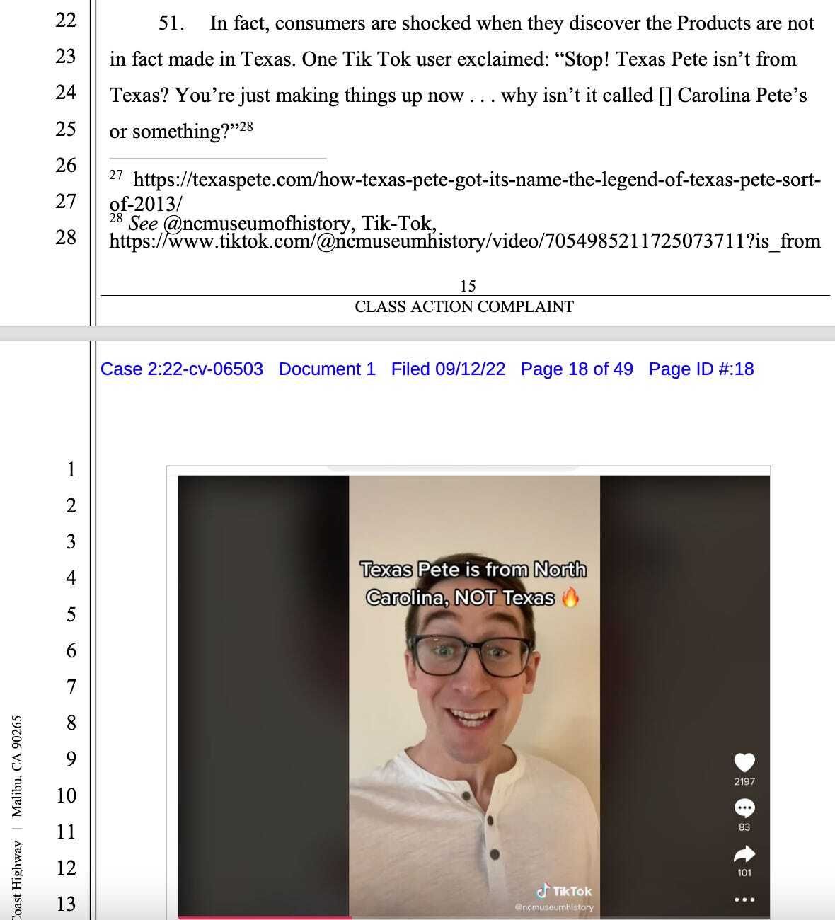 It would stand to reason that some people do not know that Texas Pete is made in North Carolina. But how many people don’t know? As evidence that the “defendant’s labeling and advertising deceives reasonable consumers… into believing that the Products are Texas products,” the attorneys for White presented a video from an authoritative source: the NC History Museum’s TikTok Guy.
