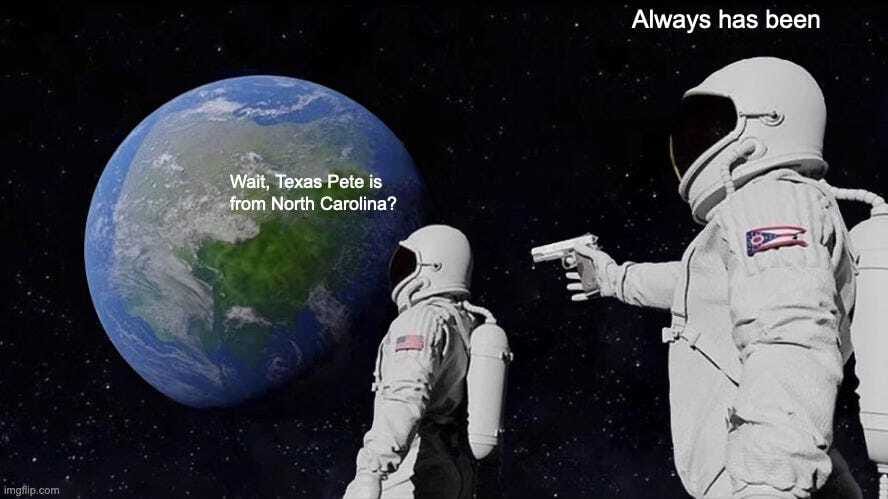 Here’s the history: Back in 1929, the Garner family of Winston-Salem wanted to make a hot sauce that sounded spicy. Someone suggested calling it “Mexican Joe,” but literally one of the Garners was like EH, NO, THAT AIN’T ‘MERICAN ENOUGH, and then someone else came up with Texas Pete, and that’s what it’s been ever since.