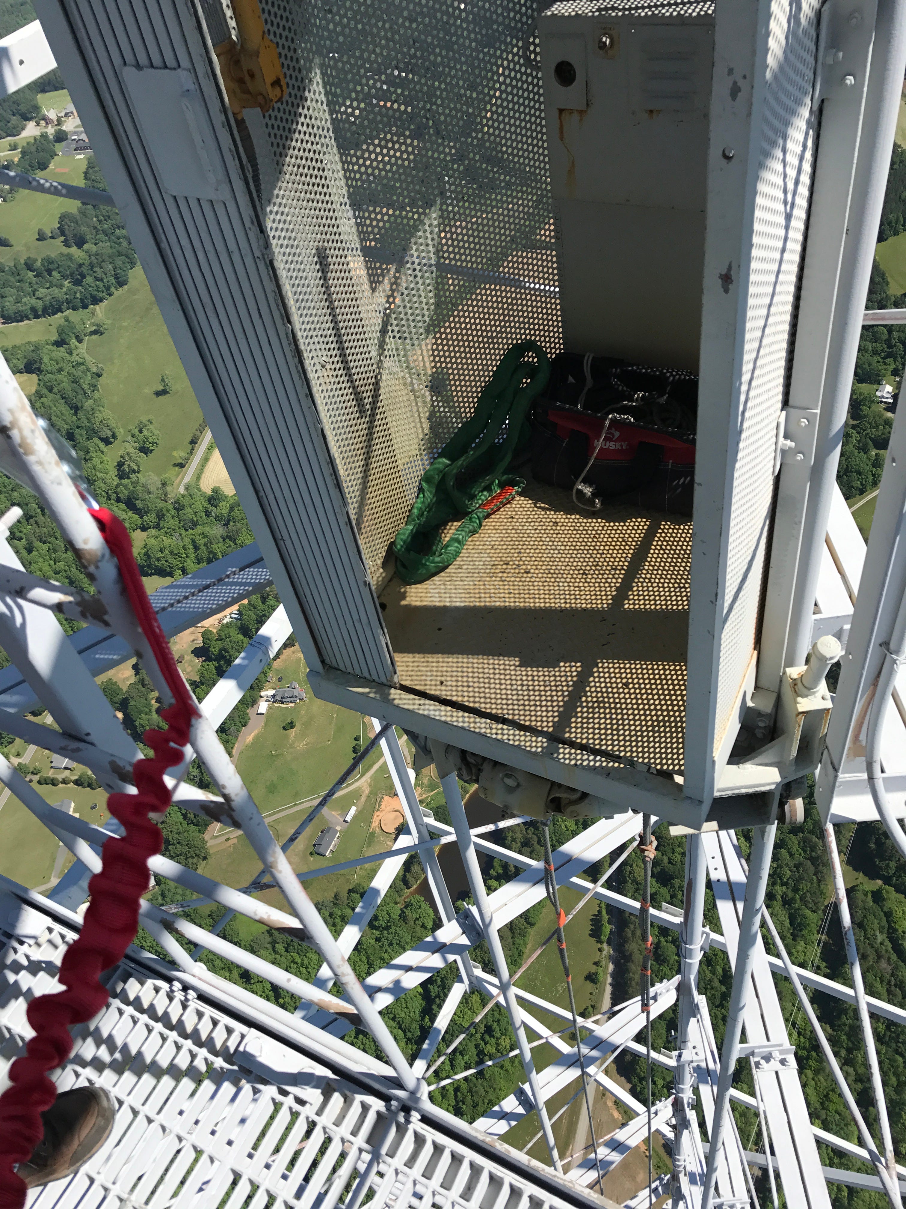 I was, admittedly, there under the best possible circumstances. I was not being hit directly by RF which, I’m told, makes your body heat up when you’re bombarded with too much of it. I stayed within the confines of some sort of steel. I was not hanging from the side as David sometimes does, changing a light bulb, or climbing to the very top to fix something on the antenna. It wasn’t cold, windy, or cloudy. The tower wasn’t swaying. I was a visitor. I got to contemplate these things because I did not have work to do. I was not afraid of falling. I was secure. I was going to be okay. If anything, I was a little worried that I was not more worried.