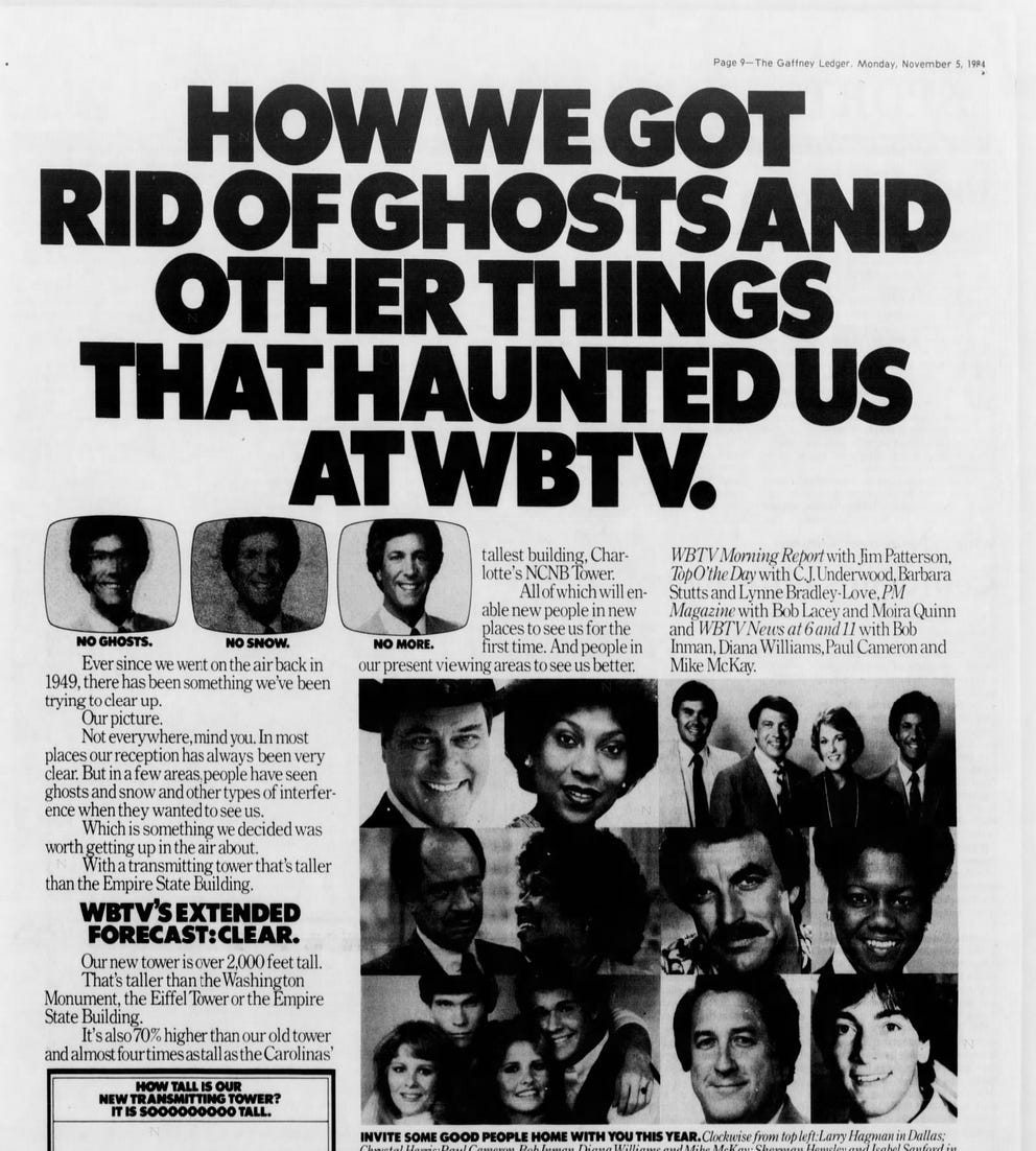 Height matters. “It’s amazing the reach that this television station has,” said John Carter, a WBTV anchor who grew up watching the station as a kid in Shelby. Combine a long history (the station was the first in the Carolinas to come on the air in 1949) with a tall tower that blasts out a high-powered signal that can penetrate into some of the most rugged nooks and crannies in the Blue Ridge Mountains, and you get ratings that have been strong since the beginning. Television viewership has traditionally been built on habit, and it’s hard to build a habit watching a station that doesn’t come in very well. “It is amazing the affinity people have for this TV station in some of the most remote areas of Western North Carolina, down in South Carolina, even to the east of Charlotte. It just amazes me,” Carter told me. “A hundred miles away in mountains, there are people that don’t have cable that still have an emotional bond with WBTV. It’s amazing to me.”