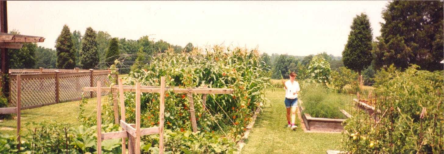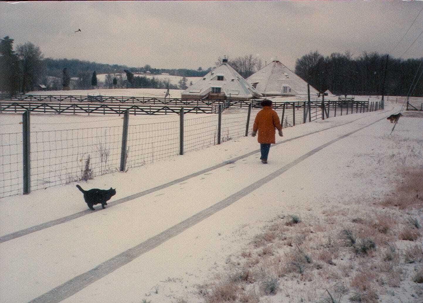 It was noisy inside. Kate remembers the sounds of her dad watching Wall Street Week on PBS echoing throughout the house. Solar panels on the blue pyramid heated water. A Finnish stove used a little bit of wood to generate enough heat to keep the whole place warm in the winter. There weren’t many windows, but that was okay, since there were big porches and decks. In general, the family spent as much time outside as possible. James planted fig, heartnut, persimmon, and sequoia trees. The family raised animals and grew all sorts of tomatoes in a large organic garden. “We would go hiking down in the woods to see the trillium blooming, or collecting hickory nuts or black walnuts for cookies,” she says. “Or, [we’d go] down deep into the woods to pick out an evergreen to use as a Christmas tree, with the dogs, horses, goats and a cat or two along to supervise.”