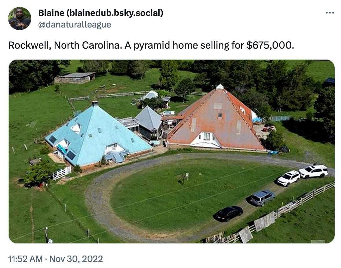 So, yes, you can buy some pyramids in rural North Carolina at a fairly good price of $675,000 (for reference, median home prices in Rockwell are about 1/2 to 1/3 of the listing price here, but this property also comes with 18 acres of land). But the bigger question here is, uh, WHO BUILDS PYRAMIDS IN ROWAN COUNTY?