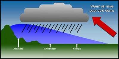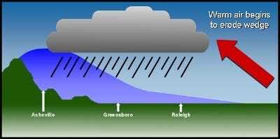When cold air damming works in tandem with a storm system which transports moisture into the cold air in place over NC, wintry precipitation occurs. Depending on how deep the layer of cold air is, the precipitation can fall as snow, sleet, freezing rain, or just a cold rain. Often, events may begin as snow or sleet (or a snow/sleet mixture) before the warmer, moist air begins to erode some of the cold air and changes the precipitation over to freezing rain or just a cold rain.