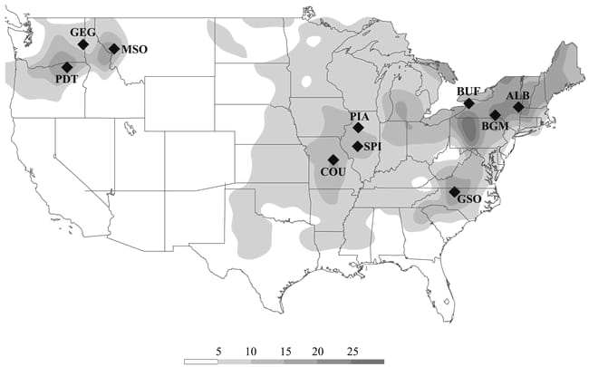 The report, which is fairly old at this point (it came out in 2002 and summarized data from 1976 through 1990), says there are a couple of major ingredients: The closeness of the Appalachian Mountains, the Gulf of Mexico, and the Atlantic Ocean, combined with a phenomenon called cold air damming, where warm air has to rise up over a mountain range, and then, on the back side of the mountains, remains aloft. That means rain falls through a cold layer of air, and then can freeze. According to my former co-worker Brad Panovich, chief meteorologist at WCNC-TV in Charlotte: “This is a phenomenon we see here more often than any part of the country.”